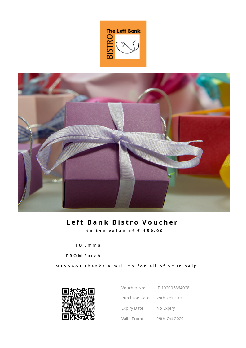 Left Bank Bistro allows you to purchase instantly printable gift vouchers, special offers and tickets using the Voucher Connect platform.